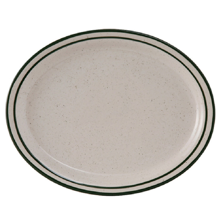The Tuxton TES-014 Platter - 13-1/4" x 10-1/2" Oval, is an exceptional piece of ceramic dishware that combines functionality with elegant design. Engineered to meet the demands of various industry segments such as restaurants, catering services, and hospitality venues, this platter is crafted from fully vitrified ceramic, ensuring durability and resistance to damage. The platter's dimensions of 13-1/4 inches by 10-1/2 inches provide ample space for serving a variety of dishes while its narrow rim adds a touch of sophistication. Safety and practicality are at the forefront of this product's design, with it being both microwave and dishwasher safe, facilitating ease of use and cleaning. Additionally, the platter is oven proof, allowing for versatile cooking and serving options. Its lead-free composition ensures a safe dining experience. The American White/Eggshell color with Green Speckle enhances its visual appeal, making it a stylish addition to any table setting. Packed by the dozen, the Tuxton TES-014 Platter offers a practical solution for businesses requiring reliable and aesthetically pleasing serving ware. This product represents a harmonious blend of quality, safety, and design, making it a valuable choice for professional settings.