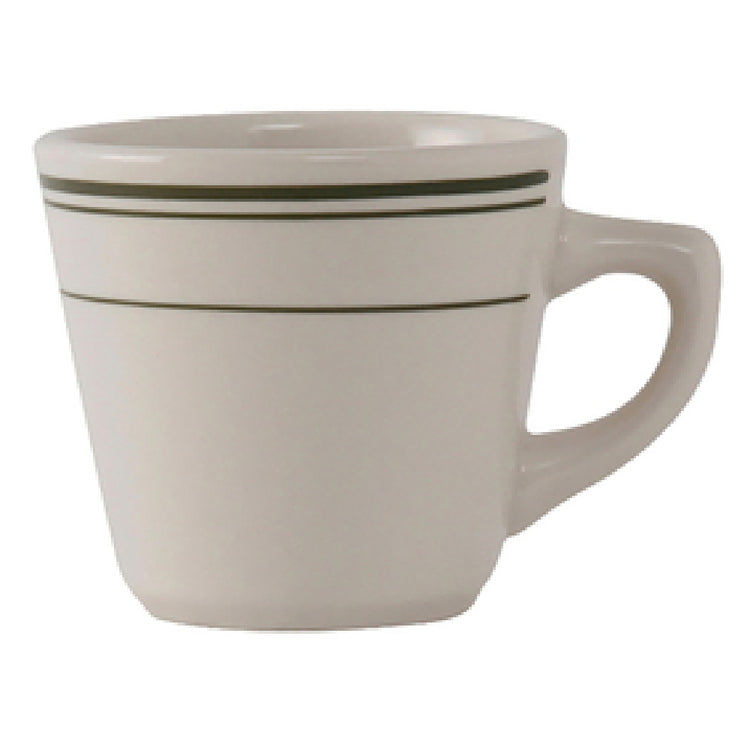 The Tuxton TGB-001 Cup 7 Oz. 3-1/4" Dia. X 3"H is an elegantly designed ceramic cup that stands out with its wide rim and rolled edge, making it both functional and aesthetically pleasing for various dining settings. This cup is crafted from fully vitrified ceramic, ensuring durability and resistance to thermal shock, which is a crucial feature for establishments such as cafes, restaurants, and hotels that require long-lasting tableware. It is lead-free, underscoring its safety and suitability for serving beverages in both commercial and home environments. The cup's dimensions, with a diameter of 3-1/4 inches and a height of 3 inches, provide a comfortable and practical size for a standard serving of coffee, tea, or other hot beverages. Microwave and dishwasher safe, this cup offers convenience in fast-paced food service settings, and its oven-proof nature adds versatility for creative serving presentations. The Tuxton TGB-001 is available in a sophisticated Green Bay color with an American White/Eggshell base accented by a Green Band, adding a touch of elegance to any tabletop. Packaged in cases of three dozen, it is an ideal choice for large-scale food service operations seeking quality and style in their drinkware.