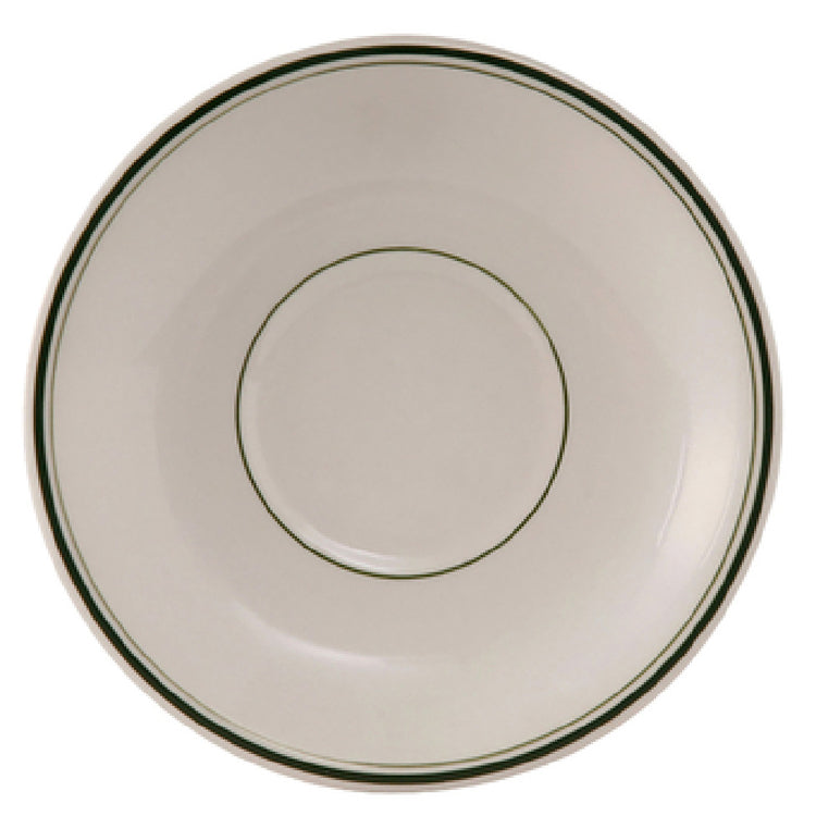 The Tuxton TGB-002 Saucer 6" Dia. Round is a versatile piece of dinnerware designed for both functionality and style, suitable for various segments in the foodservice industry. With a diameter of 6 inches, this round saucer features a coupe shape complemented by a wide rim and a rolled edge, providing durability and a classic aesthetic that fits well in both casual and upscale dining environments. Crafted from fully vitrified ceramic, the saucer is lead-free, ensuring safety and peace of mind for users. Its robust construction makes it microwave and dishwasher safe, offering convenience in busy commercial kitchens. Additionally, the Tuxton TGB-002 Saucer is oven-proof, providing flexibility for creative culinary presentations. Available in an elegant American White/Eggshell color with a distinctive Green Band, it adds a touch of sophistication to any table setting. The product is packaged in cases of three dozen, making it an efficient choice for large-scale operations. Ideal for restaurants, cafes, and hospitality establishments, the Tuxton TGB-002 Saucer combines practicality with timeless design, meeting the diverse needs of professionals in the foodservice industry.