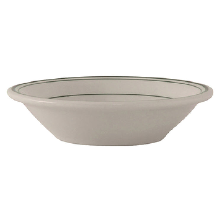 The Tuxton TGB-010 Grapefruit dish is an 11 oz. capacity ceramic plate with a diameter of 6-5/8 inches, specifically designed with a round shape and a wide rim for enhanced presentation and usability. This product features a rolled edge that contributes to its durability, making it a practical choice for a variety of dining settings. Engineered to meet the demands of modern kitchens, the Tuxton TGB-010 is microwave and dishwasher safe, providing convenience for both cooking and cleaning processes. Furthermore, this dish is oven proof and fully vitrified, which enhances its strength and resistance to moisture absorption. Made from lead-free materials, it prioritizes user safety and environmental standards. The Tuxton TGB-010 Grapefruit dish comes in a Green Bay, American White/Eggshell finish adorned with a Green Band, adding a touch of elegance to its design. This product is packaged in cases containing three dozen units, catering to large-scale needs typical in restaurants and hospitality industries. Its robust construction and classic design make it a versatile choice for various market segments, from commercial dining establishments to high-end culinary experiences, ensuring that it meets both aesthetic and functional requirements.