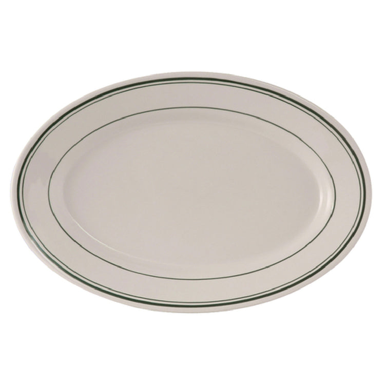 The Tuxton TGB-012 Platter 10-1/2" x 7-3/8" Oval is a meticulously designed piece of serveware, embodying a fusion of durability and elegance that caters to a variety of market segments, including hospitality, catering, and home dining. Measuring 10-1/2 inches by 7-3/8 inches, this oval platter features a wide rim and rolled edge, providing both a practical and stylish presentation for diverse culinary creations. Crafted from fully vitrified ceramic, it promises exceptional strength and is lead-free, ensuring safety and reliability in food service operations. The American White/Eggshell color with a Green Band adds a touch of sophistication, making it a visually appealing choice for formal and casual settings alike. Its compatibility with microwave and dishwasher use, along with being oven-proof, underscores its versatility and convenience in fast-paced environments. Packed by 2 dozen per case, it efficiently meets the demands of large-scale service industries. The Tuxton TGB-012 Platter stands out as a practical yet refined solution for professional chefs and home cooks, emphasizing quality and aesthetics in equal measure.