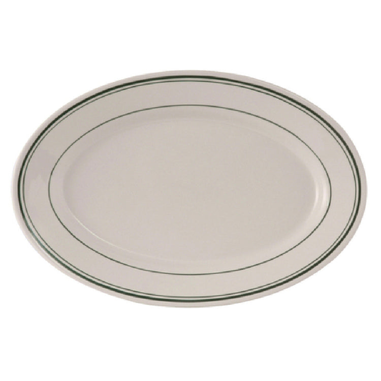 The Tuxton TGB-014 Platter 12-5/8" X 8-3/4" Oval is a meticulously crafted piece designed to cater to the diverse needs of the hospitality and culinary industries. This platter features a wide rim with a rolled edge, providing both aesthetic appeal and practical durability. Measuring 12-5/8 inches by 8-3/4 inches, its oval shape is both classic and versatile, fitting seamlessly into varied table settings. Crafted from fully vitrified ceramic, the platter is lead-free, ensuring safety and exceptional quality in food presentation. Notably, it is microwave and dishwasher safe, offering convenience in both reheating and cleaning processes, while its oven-proof nature expands its utility in food preparation. The Green Bay, American White/Eggshell finish with a Green Band adds a touch of elegance, making it suitable for both casual and formal dining environments. This platter comes packed by the dozen, making it an ideal choice for restaurants, catering services, and other food service establishments seeking reliable and stylish dinnerware. With its robust construction and versatile design, the Tuxton TGB-014 Platter stands out as a reliable choice for various market segments within the industry, ensuring both functionality and aesthetic appeal in professional settings.