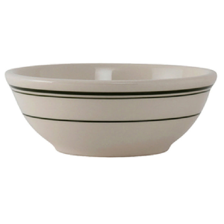 The Tuxton TGB-024 Nappie 10 Oz. 5-1/4" Dia. is a versatile piece of dinnerware ideal for various dining establishments requiring durable and reliable serving solutions. This round nappie features a 10-ounce capacity and a 5-1/4 inch diameter, making it suitable for serving soups, stews, and side dishes. The wide rim and rolled edge design not only enhance its aesthetic appeal but also provide added durability. Crafted from fully vitrified ceramic, this nappie is microwave and dishwasher safe, ensuring convenience and ease of maintenance in busy kitchen environments. It is also oven-proof, allowing for versatile use in food preparation and serving. The lead-free composition underscores its safety for serving food, making it a preferred choice for health-conscious establishments. The nappie's Green Bay, American White/Eggshell color with a green band adds a touch of elegance to any table setting. Packed by 3 dozen per case, it is an economical option for restaurants, caterers, and hospitality services seeking high-quality dinnerware. The Tuxton TGB-024 Nappie combines practicality with style, offering a dependable choice for professional settings where durability and functionality are paramount.