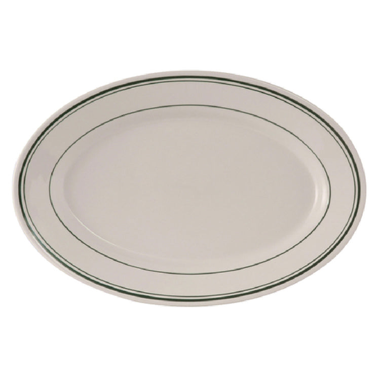 Tuxton TGB-034 Platter 9-3/8" x 6-1/2" Oval is a meticulously designed serving accessory that caters to both aesthetic and functional demands across various dining settings. With dimensions of 9-3/8 inches by 6-1/2 inches, this oval platter offers ample space for serving a variety of dishes, making it versatile for both casual and formal dining environments. The platter boasts a wide rim and rolled edge, enhancing its durability and ease of handling. Crafted from high-quality, fully vitrified ceramic, it guarantees a lead-free composition, assuring safety for food service. Its American White/Eggshell color palette, accented with a Green Band, provides an elegant touch to culinary presentations. The platter is microwave and dishwasher safe, offering convenience in both food preparation and cleanup processes. Furthermore, it is oven proof, extending its utility to warming or cooking dishes directly on the platter. Packed by 2 dozen per case, the Tuxton TGB-034 Platter supports large-scale operations, making it an ideal choice for restaurants, hotels, and catering services seeking reliable and stylish serveware. This platter combines robust construction with an elegant design, adding value to diverse market segments within the industry, from high-end dining establishments to everyday food service venues.