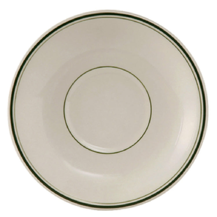 The Tuxton TGB-036 Demitasse Saucer 5" Dia. Coupe is a versatile and durable piece suitable for various hospitality environments. This saucer measures 5 inches in diameter, featuring a coupe style with a wide rim and rolled edge that enhances its aesthetic appeal and functionality. Made from fully vitrified ceramic, it is lead-free, ensuring safety and durability for long-term use. Its construction allows it to be microwave and dishwasher safe, accommodating the fast-paced needs of cafes and restaurants. Additionally, the saucer is oven proof, making it adaptable for different kitchen requirements. The Tuxton TGB-036 boasts an attractive Green Bay, American White/Eggshell finish with a distinctive Green Band, adding a touch of elegance to any table setting. Packaged in cases of 3 dozen, this saucer is an excellent choice for establishments that require both style and practicality in their dinnerware. Its robust features and appealing design make it a valuable asset in environments ranging from casual cafes to upscale dining venues, meeting the demands of both presentation and reliability.