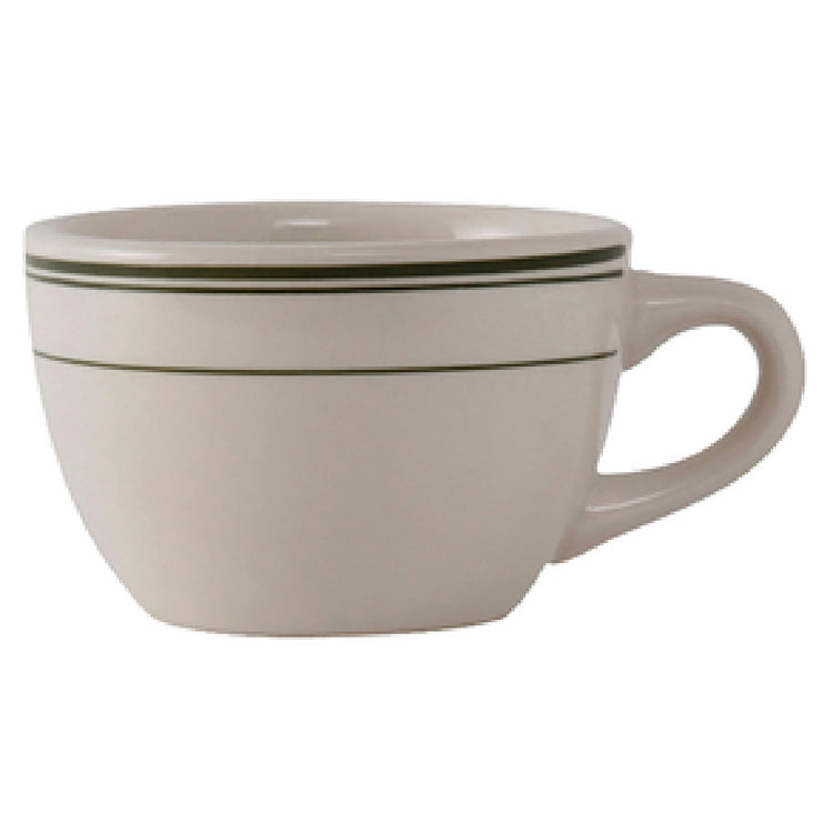 The Tuxton TGB-037 Cup 7 Oz. is a versatile ceramic cup designed for both strength and elegance, measuring 3-3/4 inches in diameter and 2-3/8 inches in height. This cup features a wide rim and rolled edge, offering both style and functionality, suitable for various dining settings, including restaurants, cafes, and hotels. Its fully vitrified construction ensures durability, making it microwave and dishwasher safe, as well as oven proof. The cup's lead-free composition adds to its safety and appeal, catering to health-conscious consumers. The attractive Green Bay, American White/Eggshell color with a Green Band makes it an ideal choice for establishments looking to maintain a classic yet distinct table presentation. Packed in cases of 3 dozen, this cup is an excellent option for businesses requiring bulk purchases. Its robust design and aesthetic appeal make the Tuxton TGB-037 Cup a valuable addition to any food service operation, emphasizing both practicality and visual allure.