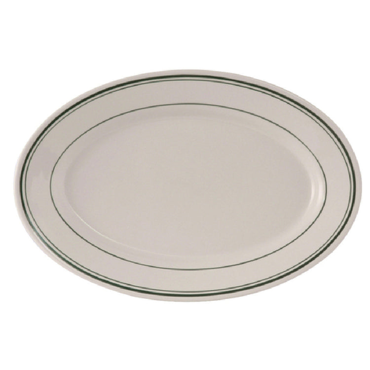 The Tuxton TGB-039 Platter 13-1/2" x 9" Oval is a versatile serving piece designed to meet the rigorous demands of various industry segments such as hospitality and food service. Measuring 13-1/2 inches by 9 inches, this platter features an elegant oval shape complemented by a wide rim and rolled edge, offering both style and functionality. Constructed from high-quality ceramic, it is fully vitrified, ensuring exceptional durability and resistance to moisture absorption. This platter is microwave and dishwasher safe, allowing for convenient and efficient use in fast-paced environments. Furthermore, it is oven-proof, providing versatility in food presentation and serving options. The Tuxton TGB-039 is lead-free, emphasizing safety and compliance with health standards. Adorned with a Green Bay, American White/Eggshell finish with a green band, this serving piece brings a touch of sophistication to any table setting. Packaged by the dozen, this platter is a practical choice for bulk purchasing, catering to large-scale operations. Its combination of durability, safety, and aesthetic appeal makes the Tuxton TGB-039 Platter a valuable addition to any professional kitchen, enhancing both the functionality and presentation of culinary offerings.