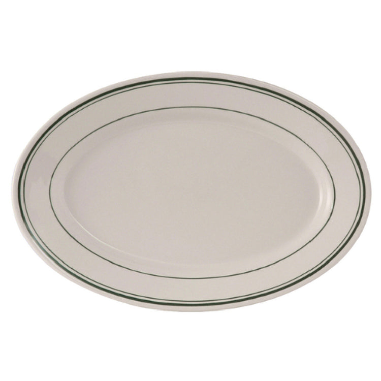 The Tuxton TGB-042 Platter 15-3/4" X 11" Oval is a versatile and durable ceramic serving piece, ideal for various segments within the hospitality and food service industries. With its dimensions of 15-3/4 inches by 11 inches, this oval platter provides ample space for presenting a wide range of dishes, from main courses to shared appetizers. It features a wide rim and rolled edge design, promoting a classic yet functional aesthetic that complements both modern and traditional table settings. The platter is microwave and dishwasher safe, ensuring ease of use and maintenance in busy culinary environments. Its oven-proof capability further extends its utility, allowing chefs to streamline food preparation and serving processes. Fully vitrified and lead-free, this platter adheres to the highest safety and quality standards, making it suitable for environments prioritizing health and sustainability. The Tuxton TGB-042 Platter is available in an American White/Eggshell finish accented with a Green Band, adding a touch of elegance to its robust functionality. Packed six per case, it is a practical choice for restaurants, catering services, and other food establishments seeking reliable and efficient tableware solutions.