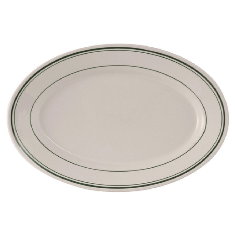 The Tuxton TGB-043 Platter 14-1/8" X 10" Oval is a versatile dining solution, crafted to enhance both functionality and elegance in various culinary settings. This platter, measuring 14-1/8 inches by 10 inches, features an oval shape complemented by a wide rim and rolled edge, offering a sophisticated presentation for any dining experience. Fully vitrified and lead-free, it provides a safe and durable option for serving food, ensuring longevity and resistance to chipping. The platter's ceramic construction allows it to be microwave and dishwasher safe, making it a practical choice for both commercial and residential use. Its oven-proof capability further increases its utility, accommodating a range of cooking and serving needs. Available in American White/Eggshell with a distinctive Green Bay band, this platter not only delivers on performance but also adds a touch of style to any table setting. With its thoughtful design and robust features, the Tuxton TGB-043 Platter is ideal for restaurants, catering services, and home kitchens looking for quality and reliability. Packed by the dozen, it is well-suited for high-volume environments where dependability and functionality are paramount.