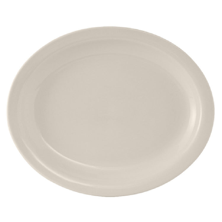 The Tuxton TNR-019 Platter 12-1/2" x 10-1/4" Oval is a meticulously crafted ceramic platter designed with precision to meet the demands of both professional and domestic dining settings. With dimensions of 12-1/2 inches by 10-1/4 inches, this platter features an elegant oval shape complemented by a narrow rim, providing a sophisticated presentation for any culinary creation. Engineered to withstand the rigors of modern kitchen environments, it is both microwave and dishwasher safe, ensuring convenient and efficient use. The platter is oven-proof, adding versatility to its range of applications, from cooking to serving. Constructed from fully vitrified, lead-free ceramic, it offers enhanced durability and safety, guaranteeing a long-lasting addition to your dining ware. With its American White/Eggshell finish, the Tuxton TNR-019 Platter exudes timeless elegance, making it suitable for various dining settings, from casual to formal dining environments. Produced in Nevada, this ceramic platter aligns with high standards of quality and craftsmanship. The product is packaged by the dozen, making it ideal for catering events or restaurant use, ensuring that you have ample supply to meet your serving needs. This platter stands out for its combination of style, functionality, and safety.
