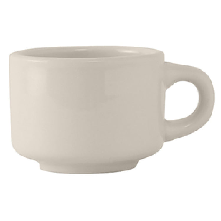 The Tuxton TRE-023 Cup 7 Oz. 3-1/4" Dia. x 2-1/2"H is a versatile and durable option for various dining and hospitality settings. With a capacity of 7 ounces, this cup is perfectly sized for serving coffee, tea, or other beverages. The dimensions of 3-1/4 inches in diameter and 2-1/2 inches in height make it a compact yet practical choice for everyday use. Its stackable design enhances storage efficiency, making it suitable for both small and large scale operations. Crafted from fully vitrified ceramic, this cup is microwave and dishwasher safe, offering convenience and ease of maintenance. Furthermore, it is oven proof, adding to its versatility in professional kitchen environments. The American White/Eggshell finish offers a classic and clean aesthetic, adaptable to various decor themes. Manufactured in Reno/Nevada, this product underscores American craftsmanship. Each case is packed with 3 dozen cups, catering to bulk purchasing needs. The Tuxton TRE-023 Cup is an excellent choice for cafes, restaurants, and catering services looking for a reliable, high-quality ceramic cup that balances functionality with a timeless design.