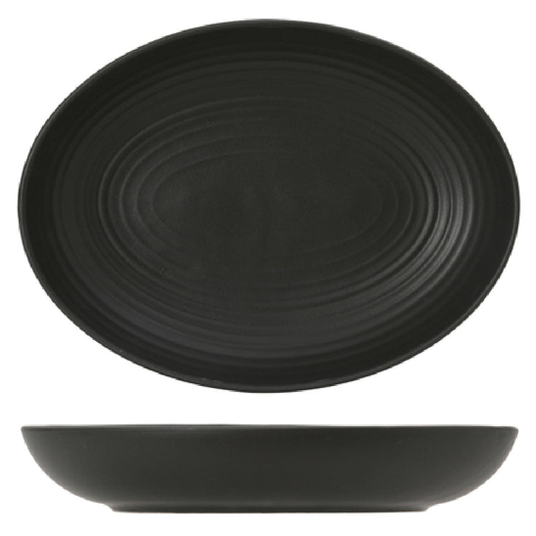 The Tuxton VBB-350Y Bowl 35 Oz. 10-3/4" X 8" X 1-7/8"H is a premium-grade serving solution designed for both aesthetic appeal and functional durability. This oval bowl, with its dimensions measuring 10-3/4 inches in length, 8 inches in width, and 1-7/8 inches in height, presents a generous capacity of 35 ounces, making it suitable for a variety of culinary presentations. Embossed for a touch of elegance, it comes in a sophisticated matte black finish, part of the TuxTrendz® collection, which is synonymous with contemporary style and refinement. Crafted from fully vitrified, lead-free porcelain, this bowl is microwave and dishwasher safe, providing convenience and safety for both commercial and home settings. Furthermore, its oven-proof nature adds to its versatility, allowing it to withstand rigorous kitchen environments while maintaining its structural integrity. The Tuxton VBB-350Y Bowl is packed by 1 dozen, catering to high-volume requirements typical in the hospitality industry. This bowl's unique combination of durability, safety, and stylish design makes it an excellent choice for upscale restaurants, hotels, and catering services seeking reliable tableware that enhances food presentation while ensuring operational efficiency.