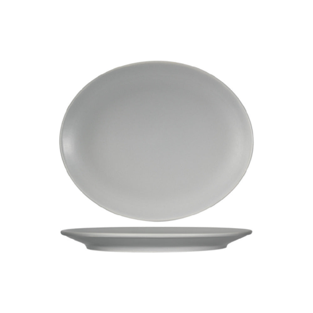 The Tuxton VGH-094 Platter is a meticulously designed ceramic serving piece, measuring 10.0 inches in width, 16.25 inches in depth, and 9.0 inches in height. Its robust construction is tailored for commercial use, lending itself well to both high-volume catering environments and elegant restaurant settings. The platter is BPA-free, ensuring safety in food handling and consumption, and is fully vitrified, which enhances its durability and resistance to moisture. Its chip-resistant and scratch-resistant qualities make it a reliable choice for busy kitchens, while its lead and cadmium-free composition underscores its commitment to safety and environmental health. The platter is dishwasher safe, providing ease of cleaning, and can be used in freezers, microwaves, and ovens, offering versatile functionality for varied culinary needs. Finished in a sophisticated Matte Gray, this Coupe-style platter from the Zion collection adds a touch of elegance to any table setting. Designed to meet the demands of professional chefs and restaurateurs, it comes packed by two dozen per case, optimizing storage and distribution efficiencies. This platter is a testament to Tuxton's dedication to quality and innovation in ceramic tableware, making it an invaluable asset across multiple segments in the foodservice industry. (Refer to Tuxton.com for Full Warranty Policy)