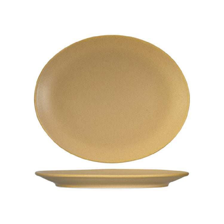 The Tuxton VYH-114 Platter, measuring 10.0"W x 12.5"D x 10.75"H, is a high-quality ceramic serving piece designed for commercial use. This platter is BPA free, ensuring safe dining experiences, and it stands out with its chip-resistant and scratch-resistant properties, providing durability in high-traffic environments. Fully vitrified, the platter does not absorb moisture, making it ideal for both microwave and oven use. It is also lead and cadmium free, aligning with stringent food safety standards. Its safe-for-food-use status ensures it meets the regulatory requirements for serving food. The platter's matte beige finish and coupe shape add an elegant touch to any dining setting, while its Zion design enhances its aesthetic appeal. Dishwasher and freezer safe, this platter allows for seamless cleaning and storage, delivering convenience to busy kitchens. Whether used in restaurants, catering businesses, or hospitality settings, the Tuxton VYH-114 Platter is a versatile accessory that complements any dining arrangement. Available in packs of one dozen, this platter is a practical choice for establishments seeking reliable and stylish serving solutions. For more detailed warranty information, please refer to Tuxton.com.
