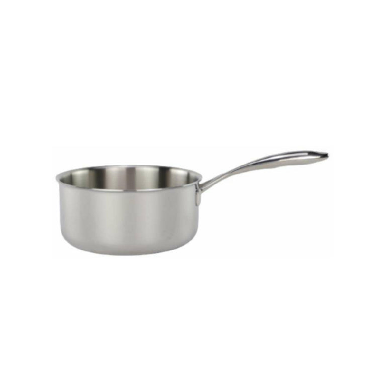 The Tuxton WTSH-0961 TUXCLAD Sauce Pan - 3 qt. (7.875" x 7.875" x 3.6875"H - O.A.) is a high-quality cookware solution designed for a wide range of culinary settings, from professional kitchens to home cooking enthusiasts. Engineered with a triply construction, this saucepan ensures even heat distribution, enhancing cooking performance and efficiency. Its rivetless design provides a smooth interior surface, making cleaning straightforward and minimizing areas where food residues can accumulate. The ergonomic hollow stainless steel handle offers a comfortable grip, reducing heat transfer and ensuring safe handling during cooking. Although it comes without a lid, the saucepan’s design is optimized for various cooking techniques that do not require covered cooking. The product is NSF certified, ensuring it meets rigorous public health and safety standards, making it suitable for commercial food service environments. Packed 6 each per case, the Tuxton WTSH-0961 TUXCLAD Sauce Pan represents a durable and versatile choice for culinary professionals and serious home cooks alike, who desire a reliable and efficient tool in their kitchen arsenal. For detailed warranty information, users are encouraged to refer to Tuxton.com.