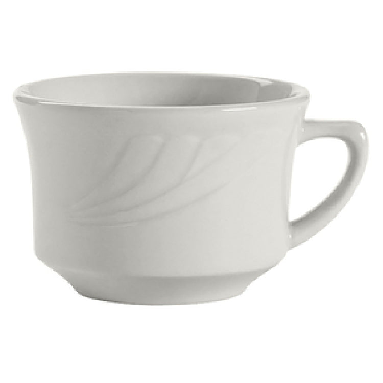 The Tuxton YPF-0752 Cup 7 Oz. 3-5/8" Dia. X 2-1/2"H is a short, embossed porcelain white cup designed specifically for a variety of industry segments, including healthcare and hospitality. Its dimensions - 3-5/8 inches in diameter and 2-1/2 inches in height - make it ideal for serving standard beverage portions. Crafted from fully vitrified porcelain, this cup is lead-free, ensuring safety and durability in high-demand environments. The Tuxton YPF-0752 is both microwave and dishwasher safe, adding convenience and efficiency for users, as well as being oven-proof, allowing for versatile serving options. Packaged by three dozen per case, it caters to bulk purchasing needs, particularly beneficial for larger establishments. The Tuxton YPF-0752 incorporates TuxCare® technology, ensuring quality and longevity in its use. This cup not only meets the aesthetic demands with its embossed design but also stands up to the rigorous use in professional settings, making it a reliable and practical choice for businesses seeking high-quality tableware solutions without compromising on safety and durability standards. With its thoughtful engineering and attention to detail, the Tuxton YPF-0752 Cup is a strategic addition to any professional kitchen or service area.
