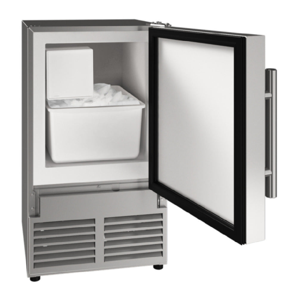 The U-Line Corporation UACR014-SS01A ADA Series Ice Maker With Bin is a versatile appliance designed for both residential and light-hospitality applications. Measuring 14 inches in width, this model can function as either a built-in or freestanding unit, providing flexibility in installation. It boasts a crescent-style ice production capability of up to 23 pounds per 24 hours, with a storage bin capable of holding 12 pounds of ice. The ice maker features a self-contained, bottom-mounted design, promoting efficient ice production and storage. A solid field-reversible stainless steel door adds to its adaptability, complemented by a black exterior and white interior. The unit is equipped with adjustable legs, allowing it to accommodate various space requirements. Utilizing R600a refrigerant, the ice maker operates on a 115v/60/1-ph electrical supply, drawing 2.5 amps. It is cULus certified, underscoring its compliance with safety standards. The U-Line UACR014-SS01A provides a reliable solution for environments requiring consistent ice production, combining functionality with a sleek design to meet diverse market needs.