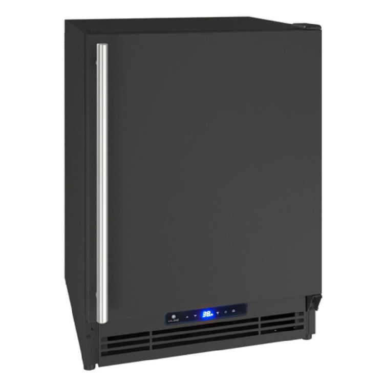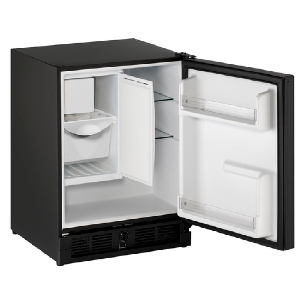 The U-Line Corporation UARI121-BS01A ADA Series Undercounter Refrigerator/Freezer is a versatile appliance designed for both residential and light-hospitality environments. With a compact footprint of 20-7/8 inches in width, this reach-in, one-section unit efficiently utilizes space while providing a capacity of 2.1 cubic feet. The refrigerator/freezer is capable of accommodating up to 24 12 oz. bottles or 44 12 oz. cans, making it an ideal solution for personal and guest refreshments. Offering a temperature range from 34°F to 45°F, it ensures optimal cooling for a variety of beverages and perishables. Additionally, it features an ice production capacity of up to 8 lbs per 24 hours. The rear-mounted, self-contained refrigeration system utilizes R134a refrigerant and operates on 115v/60/1-ph with a current draw of 2.5 amps. A field reversible solid door provides flexibility in space customization, while two removable glass shelves offer adjustable storage options. The unit's mechanical dial controls allow for straightforward operation. Wrapped in a sleek black exterior with a white interior, this refrigerator/freezer is UL certified, emphasizing its safe and efficient design, perfectly aligning with ADA guidelines for accessibility, making it an excellent choice for a variety of settings.