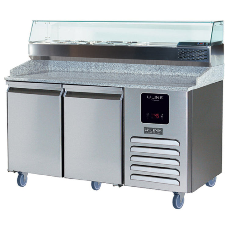 The U-Line Corporation UCPP566-SS61A (QUICK SHIP) U-Line Commercial Refrigerated Pizza Prep Table is engineered for efficiency and performance, featuring two sections with solid doors. Measuring 65-1/8"W x 31-1/8"D x 65-1/8"H, it provides a spacious 14 cubic feet of refrigeration. This prep table is equipped with a refrigerated condiment rail, maintaining temperatures between 28°F and 46°F, ensuring optimal food preservation. The electronic digital temperature control with alarms enhances precision and safety. Operating on 115v/60/1-ph with 6.5 running amps, the system includes auto defrost and utilizes an epoxy-coated and sealed evaporator. The cabinet is insulated with CFC-free high-density polyurethane and uses R449a refrigerant. For convenience, it includes four epoxy-coated wire shelves and sturdy casters for mobility. Constructed with AISI 304 stainless steel, both interior and exterior, and topped with a granite work surface, it ensures durability and style. The interior has rounded corners for easy cleaning, and it comes with an 11 ft cord with a NEMA 5-15P plug. This prep table is ETL sanitation certified, making it a versatile and reliable choice for various food service sectors, ensuring compliance with industry standards and enhancing operational efficiency.