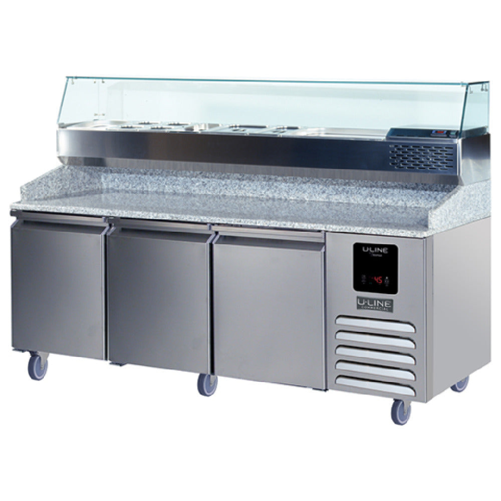 The U-Line Corporation UCPP588-SS61A (QUICK SHIP) U-Line Commercial Refrigerated Pizza Prep Table is a highly efficient and versatile solution designed for the food service industry. This three-section prep table features three solid doors and measures 88-11/32"W x 31-1/8"D x 63-15/16"H, with a spacious capacity of 21.89 cubic feet. It includes a refrigerated condiment rail, offering temperature control ranging from 28°F to 46°F, ensured by an electronic digital control system with alarms and auto defrost functionality. The 115v/60/1-ph electrical setup requires 6.5 running amps. The unit is equipped with an epoxy-coated and sealed evaporator, and it includes six epoxy-coated wire shelves for optimal storage. Its construction features a CFC-free high-density polyurethane insulated cabinet, rounded interior corners for easy cleaning, and durable AISI 304 stainless steel both inside and out, complemented by a granite worktop. Casters are included for mobility, and it comes with an 11 ft cord and plug with a NEMA 5-15P configuration. Utilizing R449a refrigerant, this product is designed for energy efficiency and environmental responsibility. The UCPP588-SS61A is ETL sanitation approved, making it a strong choice for commercial kitchens prioritizing hygiene, efficiency, and durability.