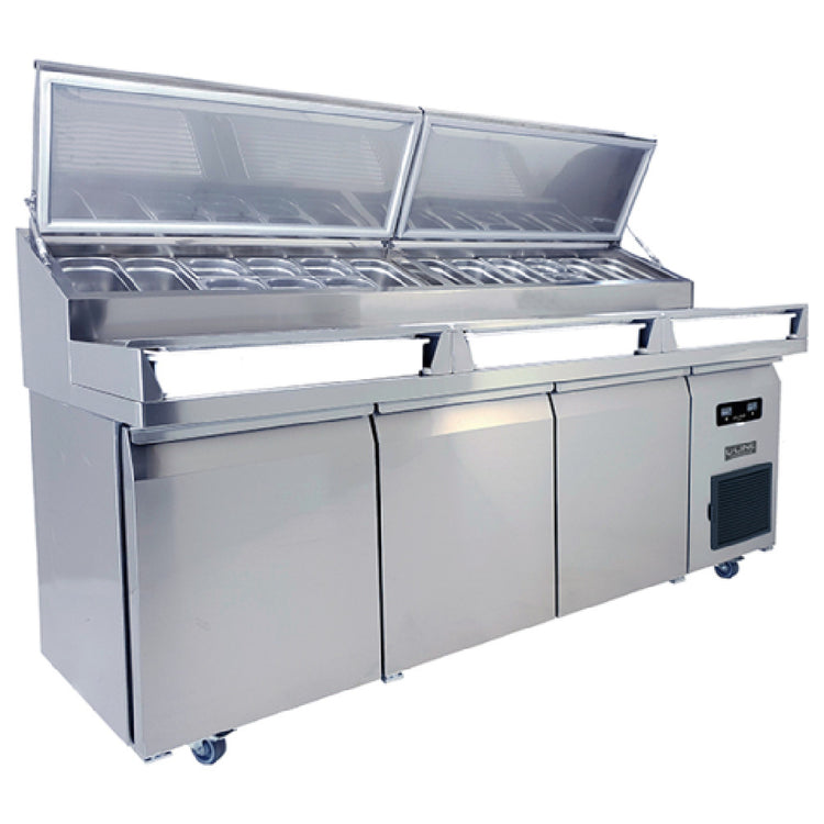 U-Line Corporation UCPT588-SS61A U-Line Commercial Refrigerated Prep Table With Sealed Condiment Rail is an advanced cooling solution tailored for commercial kitchen environments, prioritizing efficiency and durability. This three-section unit, measuring 88-5/16" in width, 36-5/8" in depth, and 63-11/16" in height, provides a substantial 21.89 cubic feet of storage. The base temperature ranges from 28°F to 46°F, ensuring optimal preservation of ingredients. The refrigerated sealed condiment rail, with a temperature range of 36°F to 50°F, accommodates diverse condiment cooling needs. Operating at 115v/60/1-ph with 9.0 running amps, it features electronic digital temperature control with alarms and an auto defrost function for consistent performance. Constructed with a CFC-free high-density polyurethane insulated cabinet and AISI 304 stainless steel interior and exterior, the prep table emphasizes both environmental responsibility and ease of cleaning. Additional features include six epoxy-coated wire shelves, removable plastic catch trays, and interior rounded corners for safety and hygiene. Equipped with casters, the unit guarantees easy mobility, while the epoxy-coated and sealed evaporator enhances durability. Utilizing R449a refrigerant, the UCPT588-SS61A combines energy efficiency with robust design, making it an essential component for any professional kitchen setup.