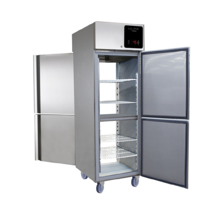The U-Line Corporation UCRP225-SS31A U-Line CommercialRefrigerator Pass-thru is a versatile, high-performance refrigeration solution ideal for various commercial settings. This one-section refrigerator offers a substantial 25 cu ft of storage capacity, featuring two half solid front doors and two half solid back doors for efficient pass-thru access. With a temperature range of 28°F to 46°F, it ensures optimal temperature control, further enhanced by an electronic digital temperature control system complete with alarms. The refrigerator's autodefrost function and polyurethane insulated cabinet contribute to its energy efficiency and reliability. It employs a top mount compressor utilizing R290 refrigerant at 3.5 oz (0.100 kg), ensuring environmentally-friendly operation. Inside, the LED interior lighting provides clear visibility, while the included six pairs of L-style tray guides offer flexible organization options. Constructed with AISI 304 stainless steel interior and exterior, it guarantees durability and hygiene, complemented by lockable doors for security. The unit is equipped with a self-lubricating cast iron evaporator fan motor and includes casters for mobility, alongside an 11 ft cord and plug compatible with NEMA 5-15P outlets. Certified by NSF and cULus, this refrigerator meets rigorous industry standards, making it a reliable choice for foodservice professionals.