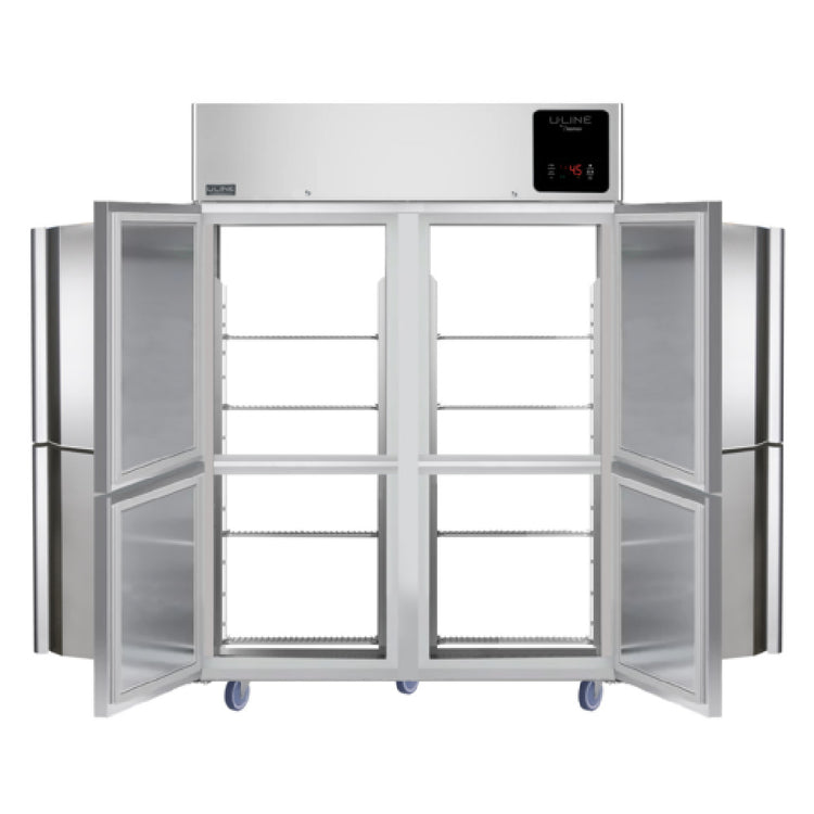 The U-Line Corporation UCRP249-SS71A U-Line CommercialRefrigerator Pass-thru is a two-section unit with a substantial capacity of 49 cubic feet, catering to the diverse refrigeration needs of commercial kitchens and food service establishments. This refrigerator features 4 half solid front doors and 4 half solid back doors, facilitating efficient pass-thru access, ideal for high-traffic environments. With a temperature range of 28°F to 46°F, it ensures optimal cooling conditions for a variety of perishables. The unit is equipped with an autodefrost function, maintaining efficiency and reducing maintenance efforts. Its polyurethane insulated cabinet enhances energy efficiency, while the electronic digital temperature control with alarms provides precise management of the interior climate. The LED interior lighting illuminates the stainless steel interior, crafted from AISI 304 grade for durability and hygiene, complemented by a top mount compressor operating with R290 refrigerant (3.5 oz or 0.100 kg). This model includes 12 pairs of L style tray guides for flexible storage options, although trays are not included. Mobility is made easy with included casters, and the 11 ft cord with plug (NEMA 5-15P) simplifies installation. Certified by NSF and cULus, this refrigerator meets rigorous industry standards for safety and performance.