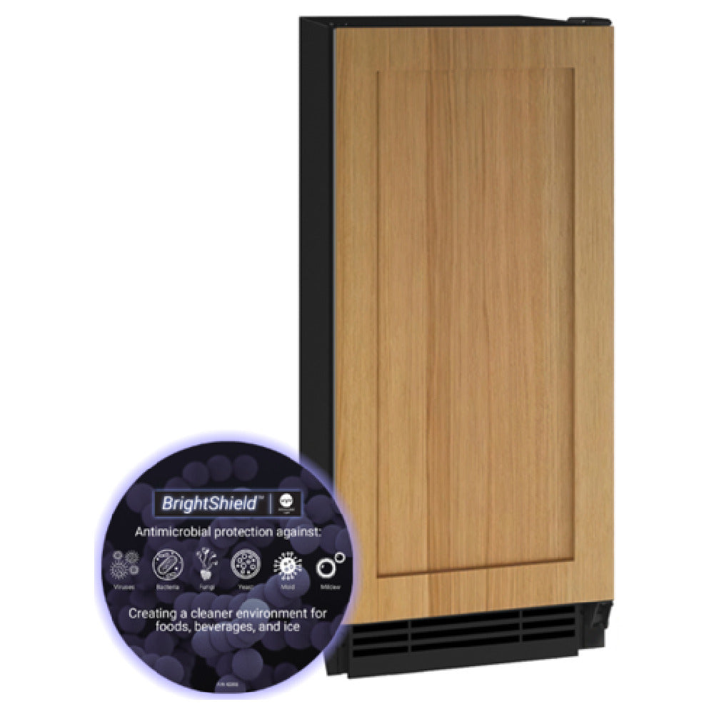 The U-Line Corporation UHCP115-IS81A 1000 Series Clear Ice Maker With Bin is a versatile appliance designed for both built-in and freestanding use, catering to a wide range of market segments. This cube-style ice maker features a self-contained bottom-mounted configuration, with a compact 15-inch width that optimizes space efficiency. It boasts a production capacity of up to 55 pounds of clear ice per 24 hours, paired with a 25-pound ice bin capacity, making it suitable for both residential and commercial applications. The unit is equipped with digital controls for precise operation and BrightShield™ antimicrobial interior lighting, promoting hygiene and user convenience. Additional features include a cleaning indicator alert and an included ice scoop and pump, ensuring seamless maintenance and usability. The ice maker is adorned with a solid field-reversible integrated door, enhancing its adaptability to various kitchen designs. Its white interior contrasts with black sides and grille, providing a sleek aesthetic. Adjustable legs offer stability on uneven surfaces, while the R600a refrigerant emphasizes environmental consideration. Operating at 115 volts, 60 hertz, and drawing 5.5 amps, this unit is cULus certified, reflecting compliance with safety standards. The UHCP115-IS81A ice maker is an efficient solution for diverse ice-making needs.
