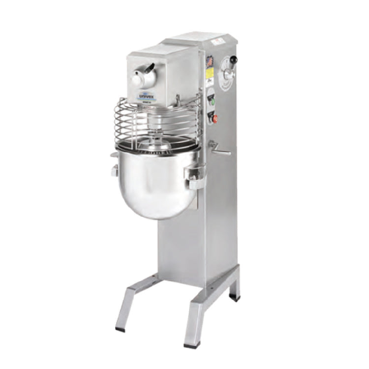 The Univex SRMF20 W/O Mixer Floor Model is a versatile and robust floor-standing mixer with a 22-quart capacity, perfect for culinary professionals requiring reliable performance in large-scale food preparation. This model is engineered without a PTO Hub but features a variable speed drive that provides precision and adaptability for a variety of mixing tasks. The mixer is equipped with a hand-operated hand crank and boasts a self-locking top and bottom mechanism for secure and hassle-free operation. Included with the unit are a stainless steel bowl, dough hook, batter beater, wire whip, and ingredient chute, along with a bowl scraper for added convenience. The start/stop button, contactor, and interlock switches enhance user safety and operational efficiency. The dishwasher-safe stainless steel safety guard further underscores its commitment to safety standards. Constructed with durable alloy gears and finished with a hybrid epoxy/polyester powder coat, this mixer is built to withstand the demands of a busy kitchen. Powered by a 1/2 hp motor, the Univex SRMF20 W/O Mixer is cETLus and NSF certified, ensuring compliance with stringent safety standards. Proudly made in the USA, this mixer is a valuable addition to any professional kitchen environment, delivering consistent and high-quality results.