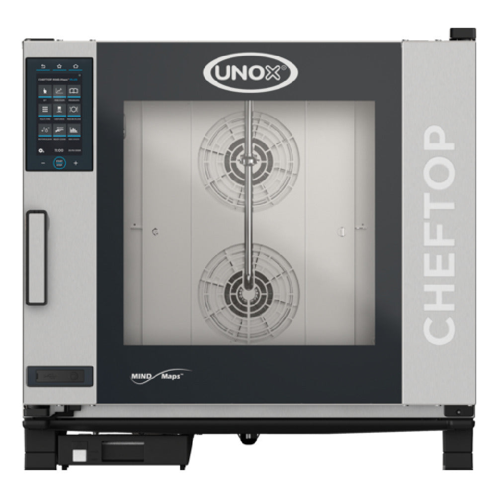 The UNOX XAVC-06FS-HPLM ChefTop MIND.Maps™ Plus Combi Oven/Steam Oven is an electric countertop oven that integrates heat, hot air flow, and steam for versatile cooking applications. With a capacity to accommodate six full-size 18" x 26" sheet pans or twelve hotel size pans, this oven is equipped with innovative MIND.Maps™ technology that allows for programmable menu customization, enhancing operational efficiency. Featuring a 2-11/16" shelf spacing, the oven is designed with a glass door that opens from right to left, providing easy access while cooking. The stainless steel interior and exterior promise durability and longevity in demanding kitchen environments. Connectivity options include WIFI and USB for seamless data transfer to HACCP software, supporting compliance and food safety management. Certified by cMETus and NSF, and awarded the ENERGY STAR® for energy efficiency, the cooking chamber is crafted from 316L stainless steel, ensuring high resistance to corrosion. This product also includes a water line connection from the oven to a ¾†mpt water connection within three feet, facilitating easy installation. Additionally, the oven comes standard with rack slides for sheet pans, making it a valuable asset for various segments within the culinary industry.
