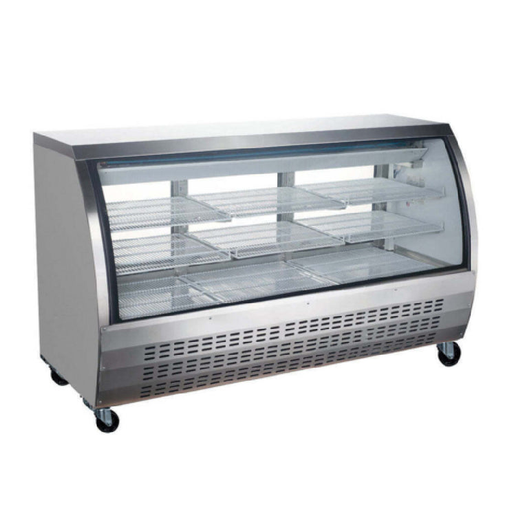 USR Brands, DC64-SS, Coldline Refrigerated Deli Display Case, 64-3/10"W, 21.9 cu. ft. capacity, bottom mounted self-contained mounted refrigeration, curved front tempered glass, sliding rear doors, (9) PVC coated adjustable wire shelves, 35.6° to 46.4°F temperature range, digital temperature control, automatic defrost, LED interior lighting, black/white/stainless steel exterior, aluminum liner interior with stainless steel floor, (4) casters (2 with brakes), R290 Hydrocarbon refrigerant, 3/5 HP, 115v/60/1-ph, 7.14 amps, cord, NEMA 5-15P, cETLus, ETL-Sanitation