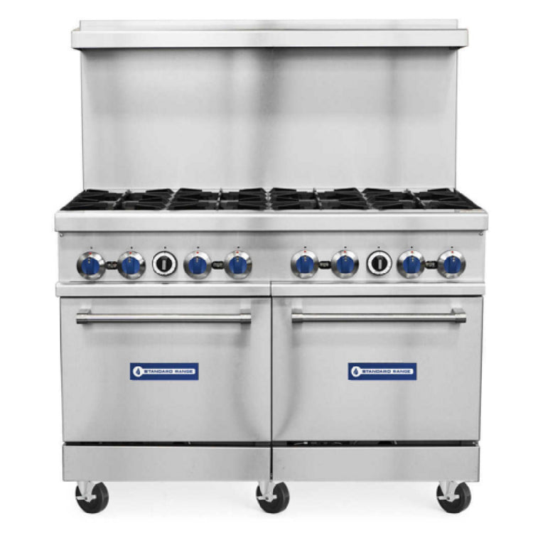 USR Brands, SR-R48, Standard Range Restaurant Range, natural gas, 48"W, (8) 30,000 BTU cast iron open burners, standard oven with U-shape 33,000 BTU/hr burner, thermostat controlled, 200° to 500°F temperature range, thermal coupling safety valve, standby pilot, pull-out crumb tray, welded frame, stainless steel handle & oven door, kick plate, stainless steel front, sides, back riser & shelf, adjustable legs, 306,000 BTU, CSA, cCSAus, CSA-Sanitation