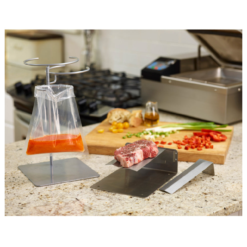 The VacMaster 98306 VacMaster™ Prep Plate is a specialized tool designed to streamline the process of transferring food to vacuum bags, making it a valuable asset in both commercial and home kitchen environments. Constructed from durable stainless steel, this prep plate ensures longevity and resistance to wear and tear, catering to the rigorous demands of food preparation. One of its standout features is the inclusion of three removable fingers, which can be adjusted to accommodate different portion sizes, offering flexibility and precision in food handling. This adaptability makes it particularly beneficial for professionals in the food industry who require consistent portion control. The VacMaster™ Prep Plate is engineered to enhance efficiency, minimizing food handling time and maximizing productivity in high-volume settings. Its intuitive design supports the seamless transition of food items to vacuum bags, aiding in the preservation process. Ideal for chefs, catering services, and food enthusiasts who prioritize quality and efficiency, the VacMaster 98306 stands out as an innovative solution that balances functionality with robust construction, serving multiple market segments within the culinary industry. Whether in a bustling restaurant kitchen or a home cooking space, this prep plate contributes to streamlined operations and optimal food preservation.