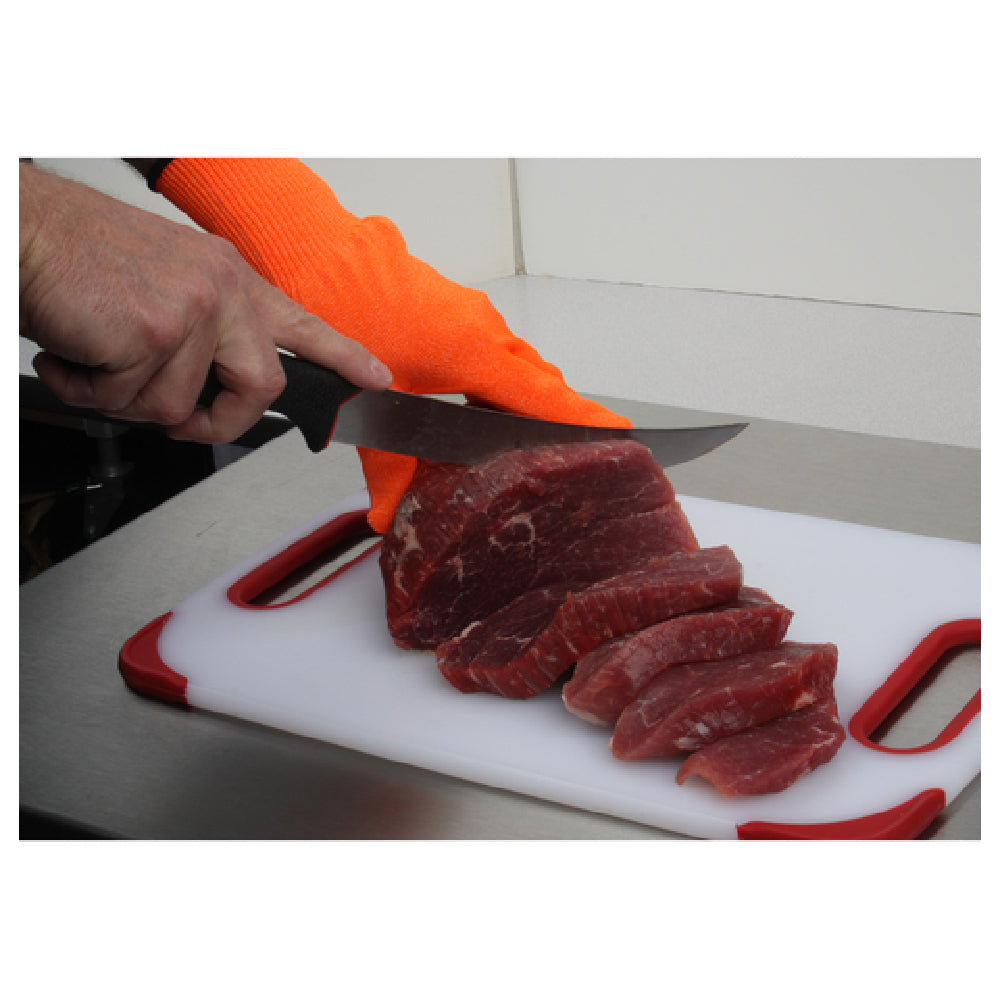 The VacMaster CR13631ORXS Cut Glove X-Small Orange is a meticulously engineered glove designed to cater to industries where safety and hygiene are paramount. Constructed with high-performance fibers reinforced with two strands of stainless steel, it offers robust protection with an ANSI Level A4+ cut resistance. This 13-gauge glove ensures both durability and flexibility, making it ideal for professionals who require precision and safety in their work. As it is FDA approved and 21 CFR certified, the glove is safe for direct food contact, meeting stringent industry standards. The ambidextrous design allows users the convenience of wearing it on either hand, while the color-coded bound edge in orange facilitates easy size recognition and compliance. Lightweight and machine washable, the VacMaster CR13631ORXS Cut Glove resists stains and shrinkage, ensuring long-term usability. Proudly made in the USA, this glove meets various industrial needs, from food processing to culinary applications, where hand protection is essential without compromising on comfort or functionality.