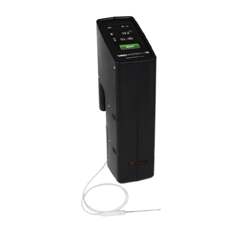 The VacMaster SV10 Immersion Circulator is a compact yet powerful sous vide device engineered for culinary precision. Measuring 3-3/4" Wide by 6-1/8" Deep by 13-7/8" High, this circulator is designed to accommodate sous vide containers with capacities up to 10.5 gallons (40 liters). The device operates within a temperature range of 77°F to 210°F, ensuring precise cooking with a remarkable temperature stability of ±1°F. Its user-friendly touch screen control panel enhances ease of use and accessibility. For safety and reliability, the SV10 includes high temperature protection and a low water alarm. The circulator is equipped with a 12-volt circulation pump and boasts a 1300-watt heating capability, powered by a 120v/60/1-phase electrical system. Additionally, it features an adjustable mounting clamp for versatile setup options and offers a choice of seven language settings, catering to a diverse user base. This combination of features makes the VacMaster SV10 an indispensable tool for professional chefs, gourmet enthusiasts, and food industry professionals seeking consistent results in sous vide cooking. Its robust design and advanced functionalities provide an edge in precision cooking, making it a valuable asset in kitchens that prioritize quality and efficiency.