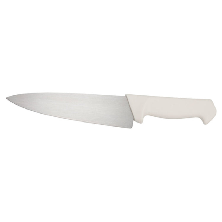 The VacMaster WP808 Value Grip Cook's Knife 8" is a versatile kitchen tool designed for both professional and home cooks. Featuring front and back hilt guards, this knife provides enhanced safety and precision during use, making it suitable for a variety of culinary tasks. The 8-inch blade is optimized for efficient slicing, dicing, and chopping, catering to diverse cooking requirements. Its single injection mold handle, crafted in a sleek white finish, ensures a comfortable and secure grip, reducing hand fatigue during extended use. The knife's handle is engineered to meet the rigorous standards of the National Sanitation Foundation (NSF), emphasizing its commitment to food safety and hygiene. This certification makes it an ideal choice for commercial kitchens and food service environments where maintaining high sanitation standards is critical. The VacMaster WP808 is an excellent option for culinary professionals seeking a reliable and safe knife for everyday use, as well as for home chefs who desire a high-quality tool to elevate their cooking experience. Its thoughtful design and robust construction offer a dependable performance that meets the demands of various market segments within the culinary industry.