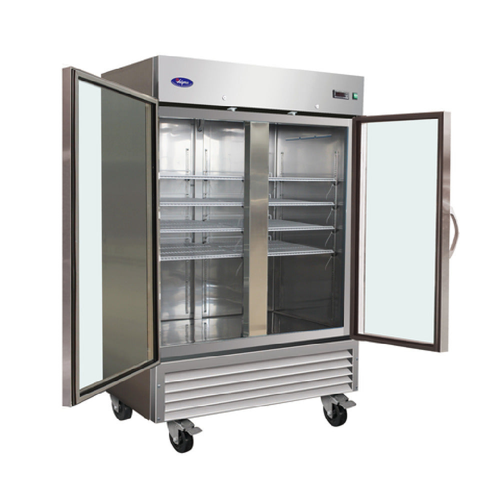 Valpro VP2FG-HC Freezer Reach-in Two-section is a high-capacity refrigeration solution, ideal for commercial kitchens and food service establishments. This freezer features a 54-inch width and offers a substantial 49 cubic feet of storage capacity, providing ample space for bulk storage needs. Equipped with self-contained bottom-mounted refrigeration, it ensures efficient cooling performance. The unit operates on R290 Hydrocarbon refrigerant, emphasizing environmental responsibility. The digital thermostat with an LED display allows precise temperature control, enhancing functionality for various applications. The interior is illuminated with LED lighting, ensuring visibility and convenience in busy kitchen environments. The freezer includes eight adjustable epoxy-coated wire shelves, providing flexibility in organizing products. Constructed with a robust 430 stainless steel exterior and a 304 stainless steel interior, it ensures durability and hygiene. The two self-closing glass doors are equipped with locks, providing security for stored items. The freezer is mounted on four 4-inch casters, two of which are locking, allowing ease of mobility and stability. Operating at 115V/60/1-ph with a 1 HP motor and drawing 9.0 amps, it is designed for reliable performance. The unit comes with a cord and is compatible with a NEMA 5-15P outlet. It is ETL and ETL-Sanitation certified, ensuring compliance with safety and quality standards.