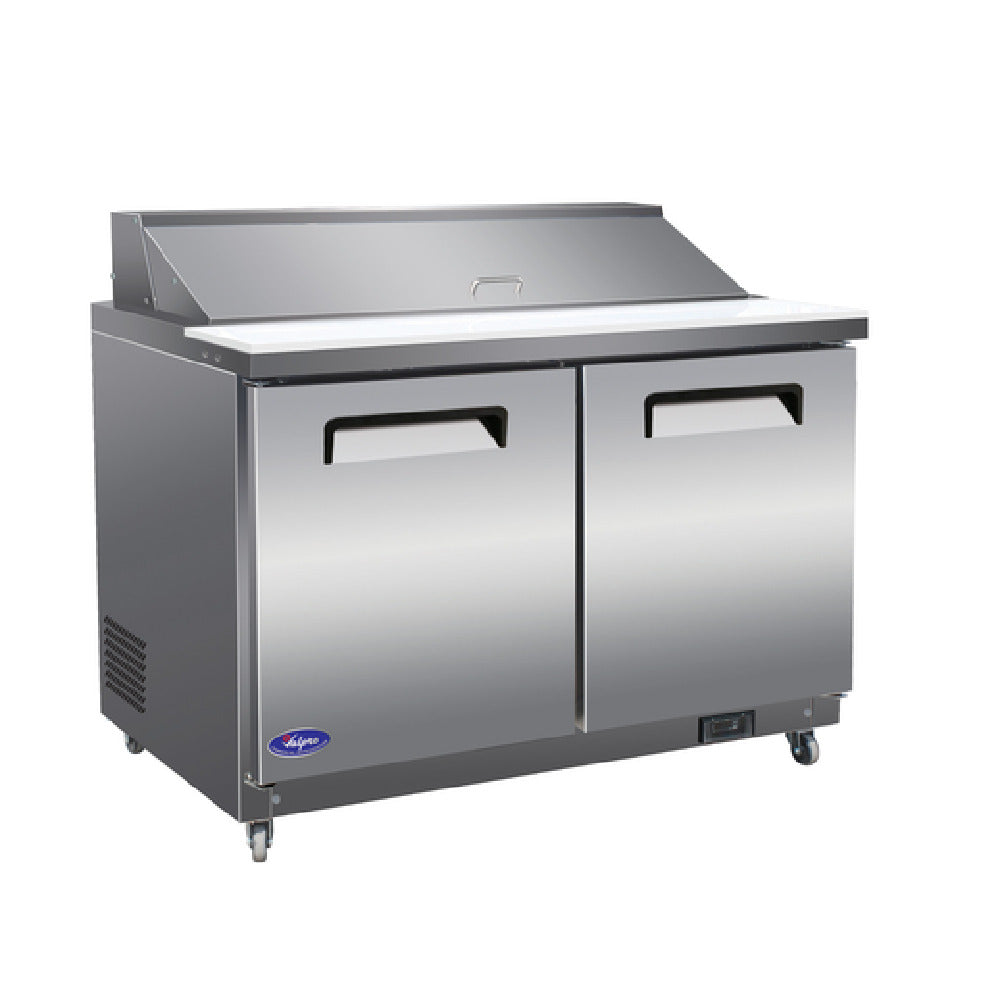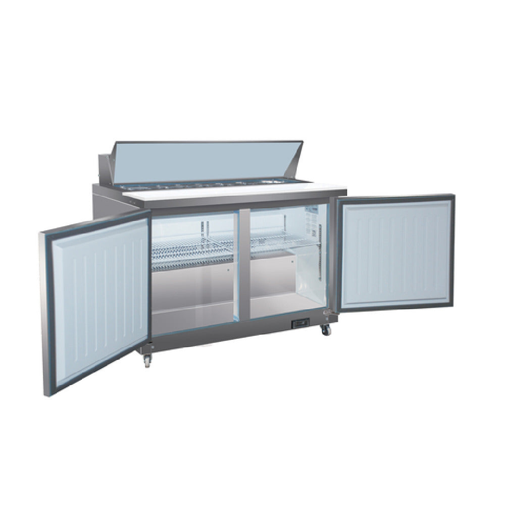 The Valpro VP48S-HC Sandwich/Salad Top Refrigerator Two-section 48"W is a versatile and efficient refrigeration unit, ideal for commercial kitchens specializing in fresh food preparation. With a spacious 12 cubic feet capacity, it accommodates a variety of ingredients with ease. This unit employs R290 Hydrocarbon refrigerant, ensuring eco-friendly operation. The appliance is powered by a 1/2 HP motor, operating on 115 volts, 60 hertz, and a single phase, drawing 4.5 amps. Its robust design is highlighted by a 430 stainless steel top, front, and sides, complemented by a 304 stainless steel floor, while the interior features a white ABS lining. The refrigerator includes a 48"W x 11-1/2"D removable white cutting board, enhancing its functionality for food prep. Each section is equipped with an adjustable epoxy-coated wire shelf, providing customizable storage solutions. A pair of solid hinged self-closing doors maintain temperature control, supported by a digital thermostat with an LED display for precise monitoring. The unit is mobile, thanks to its four casters, and comes with twelve 1/6 size polycarbonate pans, enhancing its utility for high-volume operations. The ETL and ETL-Sanitation certifications affirm its compliance with industry standards, making it a reliable choice for foodservice establishments.