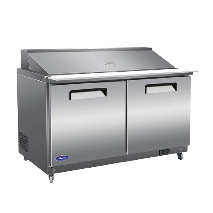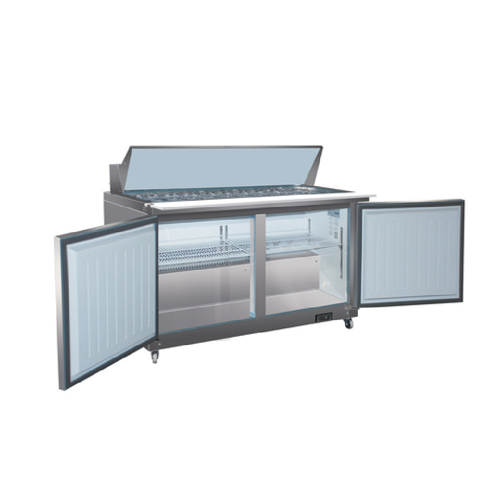 The Valpro VP60SM-HC Sandwich/Salad Top Refrigerator Two-section 61"W is meticulously engineered to meet the demanding needs of food service environments, providing versatile and efficient refrigeration solutions. With a robust capacity of 16 cubic feet, this two-section unit combines functionality and durability. It measures 61 inches in width and is equipped with auto-defrosting and evaporation technology to maintain optimal temperature consistency. The refrigerator features a digital thermostat with an LED display, ensuring precise temperature control. Its construction includes (2) solid hinged self-closing doors, a stainless steel insulated cover, and a 430 stainless steel top, front, and sides, offering durability and ease of maintenance. The interior comprises white ABS with a 304 stainless steel floor, enhancing hygiene and longevity. This unit includes (24) 1/6 size polycarbonate pans, a 61" wide by 9" deep removable cutting board, and (2) adjustable epoxy-coated wire shelves, providing ample storage and preparation space. Mobility is facilitated by (4) casters, while the R290 Hydrocarbon refrigerant ensures eco-friendly operation. The unit operates on a 1/2 HP motor, drawing 4.3 amps at 115 volts/60 Hz/1-phase, and includes a cord with NEMA 5-15P, ensuring compatibility with standard electrical outlets. ETL and ETL-Sanitation certified, this refrigerator is an ideal choice for sandwich and salad preparation needs.