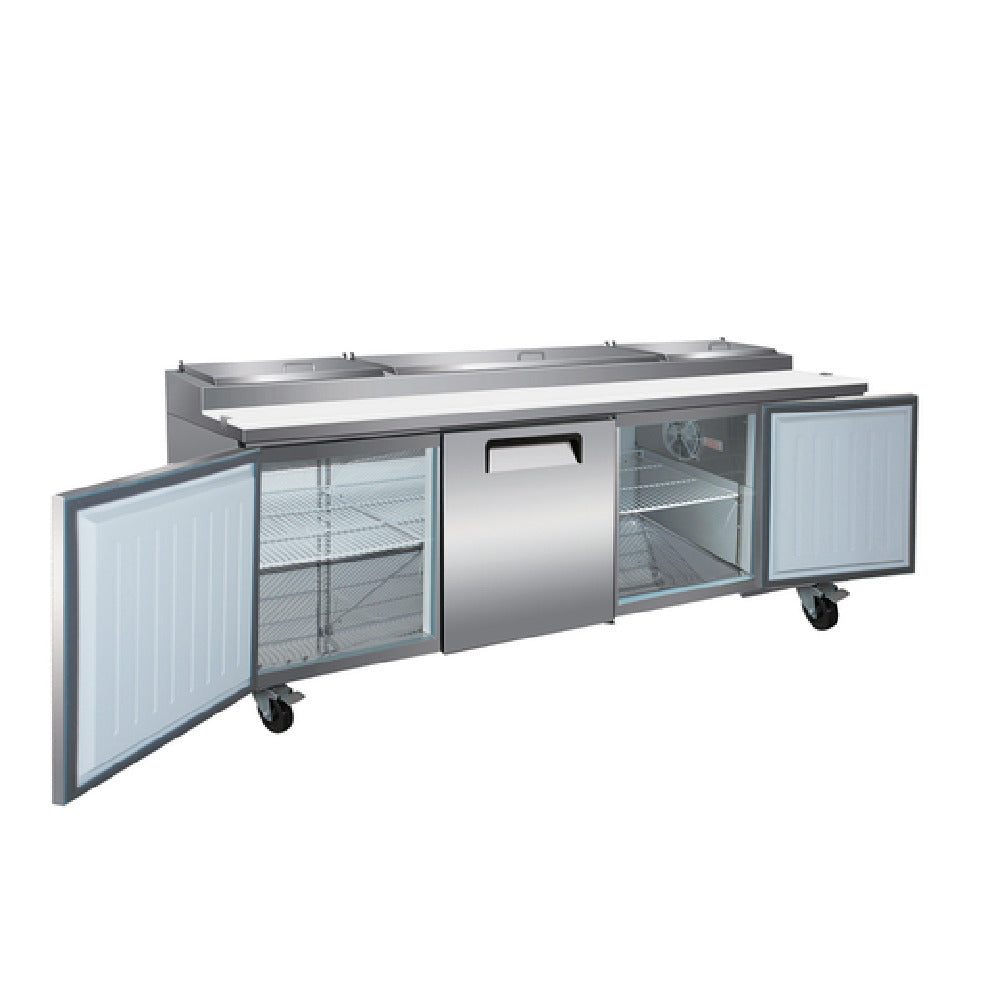 - 94"W three-section pizza prep table with 32 cu.ft. capacity