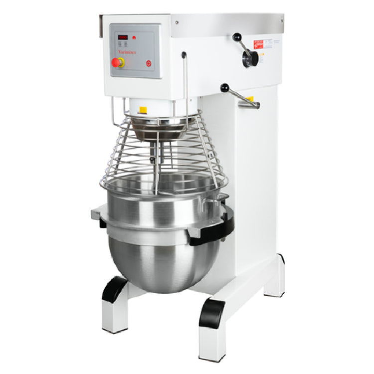 The Varimixer V80 Planetary Mixer 80Q is a powerful and versatile machine designed for high-demand kitchen environments, including bakeries and large food production facilities. This mixer is equipped with a robust 4 HP motor and features overload protection to ensure longevity and performance even under heavy use. With a variable speed mechanism, it provides an agitator speed range from 53 RPMs to 288 RPMs, allowing for precise mixing suited to various ingredients and textures. The front-facing controls are user-friendly and include a 90-minute timer, offering convenience and efficiency in operation. Additionally, the integrated bowl guard and bowl lift lever with hydraulic damper enhance safety and ease of use. The side-mounted #12 hub adds to its versatility, accommodating additional attachments for expanded functionality. The durable white powder-coated finish ensures the mixer’s resilience in demanding settings. The package includes a stainless steel bowl, hook, whip with stainless steel wires, aluminum beater, and ingredient chute, providing a comprehensive set of tools for diverse mixing needs. Certified by cETLus and NSF, this mixer meets rigorous standards for safety and sanitation, making it a reliable choice for professional culinary applications.