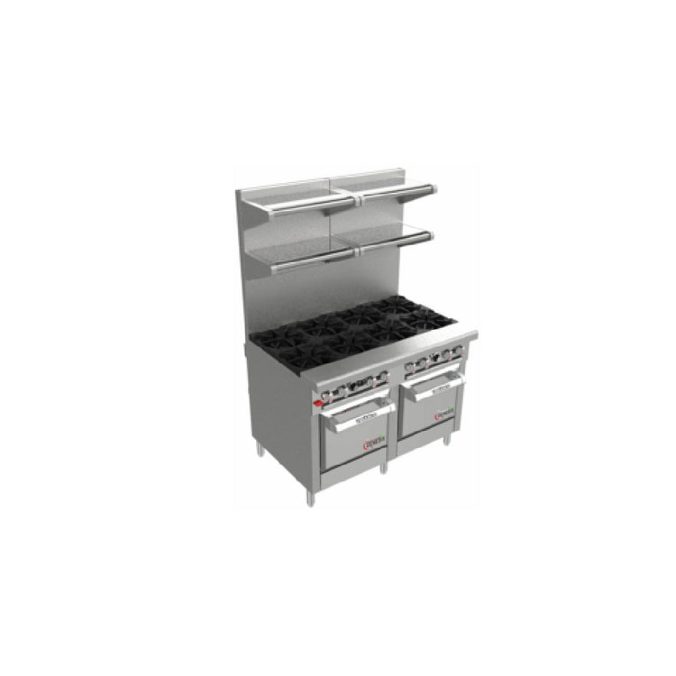 The Venancio G482CO-48B_LP Genesis Series Restaurant Range is a high-performance gas range measuring 48 inches wide, tailored for the demanding environment of professional kitchens. Featuring eight open non-clog burners, this range enhances cooking efficiency, complemented by removable cast iron grates for easy maintenance. Each burner is equipped with independent manual control valves and a standing pilot for precise heat management. The unit includes two convection ovens, each with a 2-speed fan and spark ignitions, enhancing baking and roasting capabilities. Each oven is furnished with four racks and offers five adjustable shelf positions, catering to diverse culinary needs. The robust construction includes a 22.5-inch high two-piece stainless steel flue riser with a reversible and removable over shelf, and a 7-inch front rail. The durable stainless steel build extends to the front, sides, and crumb tray, as well as a fully welded, seamless oven door and cavity. With a power output of 204,000 BTU and a 1/4 HP motor, the range operates on two 115v/60/1-ph circuits drawing 3.70 amps. It comes with a cord and plug, is cULus and UL EPH Classified, and includes an LP conversion kit and pressure regulator, making it a versatile choice for any professional food service setting.