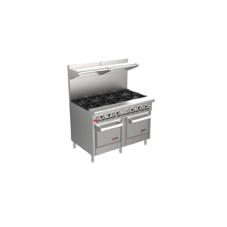 The Venancio G482ST-48B_LP Genesis Series Restaurant Range Gas 48"W is a robust kitchen appliance designed for professional culinary settings. Featuring eight non-clog self-cleaning burners, this range ensures consistent and efficient cooking performance across its 48-inch width. The removable cast iron grates provide durability and ease of maintenance. Each burner is equipped with independent manual control valves and a standing pilot, allowing precise temperature regulation. This model includes two standard ovens with spark ignition, each offering three racks and four rack positions, facilitating versatile cooking options. The 22-1/2" two-piece stainless steel flue riser, complete with a reversible and removable overshelf, optimizes kitchen space and functionality. The range’s construction boasts a 14-gauge interlocking fully welded frame for structural integrity, complemented by a stainless-steel front, sides, and removable crumb tray. The oven cavity is fully lined with stainless steel, ensuring durability and ease of cleaning. With 204,000 BTU output, it meets rigorous cooking demands. The unit is equipped with 6" adjustable legs for stability and includes a LP conversion kit and pressure regulator. Certified by cULus and UL EPH, this range represents reliability and excellence in commercial kitchen environments.