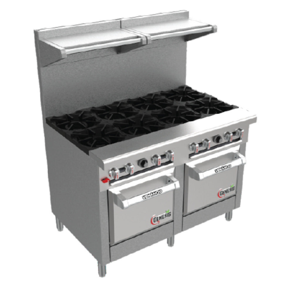 The Venancio G602ST-60B_LP Genesis Series Restaurant Range is a high-performance gas appliance with a significant 60"W footprint, tailored for diverse culinary environments. It boasts an array of ten non-clog self-cleaning burners, each equipped with independent manual control valves, ensuring precise cooking flexibility for chefs in bustling kitchen settings. The removable cast iron grates enhance cleaning efficiency, while the standing pilot and spark ignition facilitate seamless operation. This versatile range includes two standard ovens, each featuring a stainless steel cavity—top, bottom, and sides—and a fully welded seamless door for enhanced durability. The ovens come with three racks and four rack positions per oven, offering ample cooking space. Its robust design is underscored by a 14-gauge interlocking fully welded frame and 6" adjustable legs, supporting a total output of 245,000 BTU. The range is complemented by a 22-1/2"H two-piece stainless steel flue riser with a reversible and removable over shelf, as well as a 7" front rail and a removable crumb tray for added convenience. The appliance meets cULus and UL EPH Classification standards. This LP-compatible range includes a conversion kit and pressure regulator, making it a versatile choice for professional kitchens prioritizing reliability and performance.