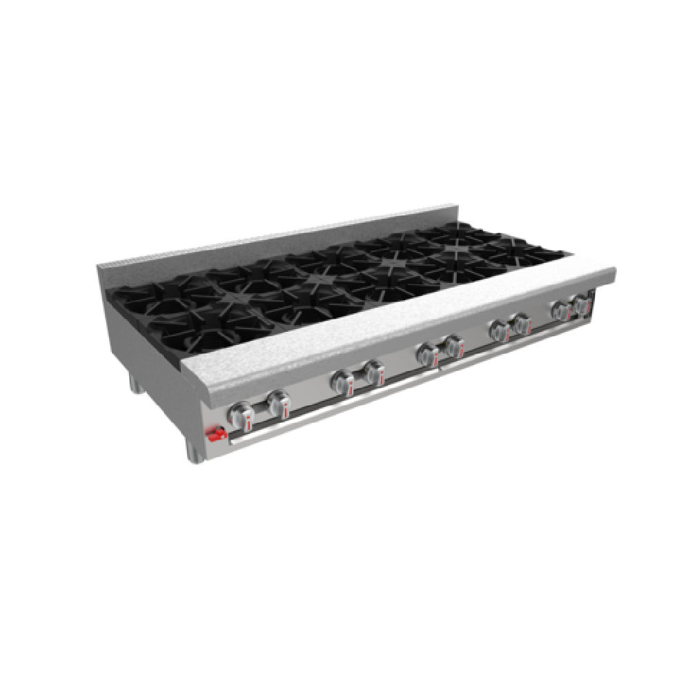 The Venancio G60CT-60B_NAT Genesis Series Hotplate is a gas-powered countertop appliance measuring 60 inches wide. It features ten two-piece heavy-duty cast iron burners, ensuring robust cooking performance for high-volume kitchens. Each burner is equipped with a removable cast iron grate, facilitating easy cleaning and maintenance. The hotplate is designed with ten independent manual control valves, offering precise control over each burner's heat output, supported by a standing pilot per burner for reliable ignition. Crafted with a stainless steel front and sides, this model is built for durability and longevity in demanding commercial environments. The appliance includes a 6-inch deep stainless steel front rail for added functionality and a welded frame for enhanced stability. Adjustable polished chrome legs, measuring 4 inches, allow for seamless integration into various kitchen setups. With a total heat output of 180,000 BTU, this hotplate delivers powerful performance. It is cULus and UL EPH Classified, ensuring compliance with safety and sanitation standards. The unit comes with an LP conversion kit and a pressure regulator, adding versatility and convenience. Overall, the Venancio G60CT-60B_NAT Genesis Series Hotplate represents a reliable and efficient solution for professional kitchens seeking high-performance cooking equipment.