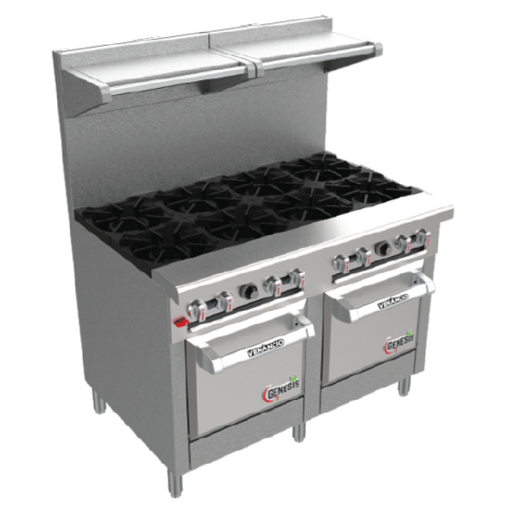 The Venancio G722ST-72B_LP Genesis Series Restaurant Range is a powerful gas-operated kitchen appliance, measuring 72 inches in width, designed for high-demand commercial kitchens. It features 12 non-clog self-cleaning burners, each with removable cast iron grates and independent manual control valves, ensuring precision cooking. The unit includes two standard ovens with spark ignition, each equipped with three racks and four rack positions, providing versatile cooking options. The robust 22.5-inch high two-piece stainless steel flue riser is both reversible and removable, accompanied by an over shelf for additional storage. The 7-inch front rail and stainless steel front, sides, and crumb tray enhance its durability and aesthetic appeal. Built with a 14-gauge interlocking fully welded frame and a fully welded seamless oven door, this range is designed for longevity. It delivers an impressive 286,000 BTU, meeting the rigorous demands of busy kitchens. Standing on 6-inch adjustable legs, the range offers stability and ease of installation. It is cULus and UL EPH Classified, and comes with an LP conversion kit and pressure regulator. This restaurant range is ideal for establishments seeking reliable, high-performance cooking equipment that can handle a variety of culinary tasks.