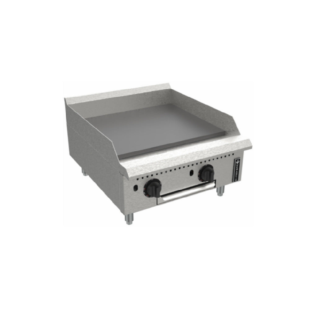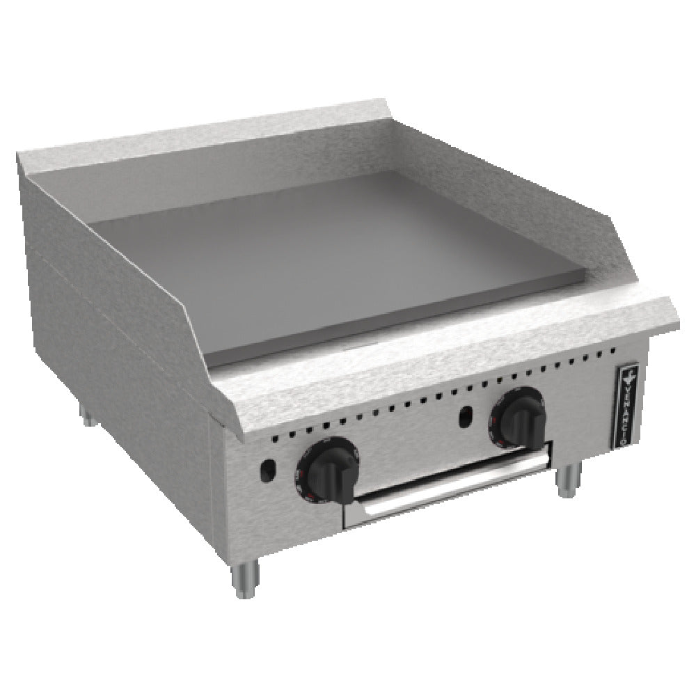 The Venancio PGT24G-CT_NAT Prime Griddle is a gas-powered, countertop appliance engineered for high-performance cooking in commercial kitchens. With a substantial 24"W x 30-33/64"D cooking surface, it is equipped with a 3/4" thick smooth polished steel plate, ensuring durability and heat retention for consistent cooking results. This griddle features two thermostatic control valves that allow precise temperature regulation for diverse cooking needs. Each enameled steel burner is strategically placed every 12", optimizing heat distribution across the surface. The accessible pilots through the front panel facilitate easy ignition and maintenance, complemented by a removable stainless steel grease tray for efficient cleaning. Constructed from 14 gauge polished stainless steel, the panel and sides offer enhanced resilience and an attractive finish. The griddle stands on 4" adjustable chromed carbon steel legs, providing stability and adaptability to various kitchen setups. Its impressive 70,000 BTU output guarantees powerful heating capabilities, suitable for high-volume cooking environments. Certified with cULus and UL EPH Classified, the Venancio PGT24G-CT_NAT Prime Griddle is a reliable and compliant solution for restaurants, catering services, and food service establishments seeking robust performance and quality craftsmanship in their cooking equipment.