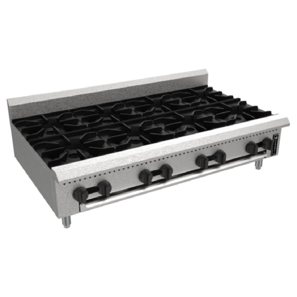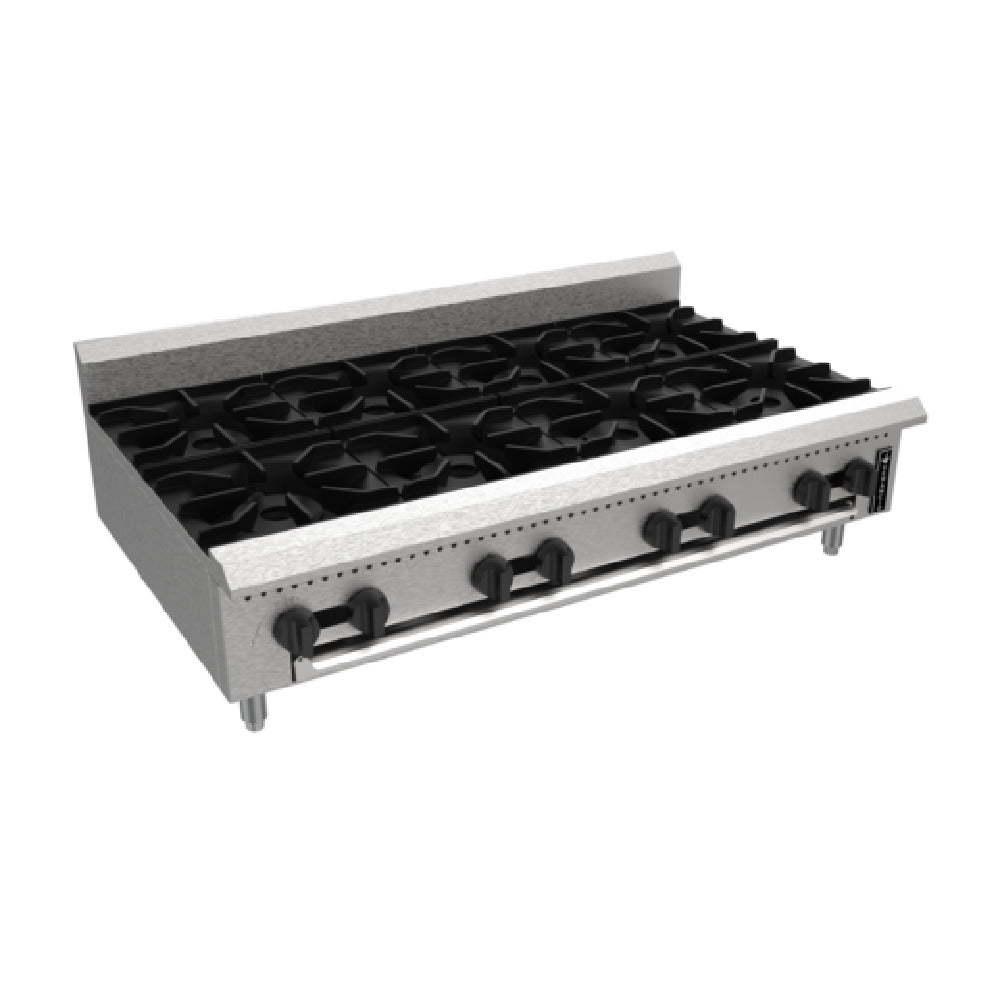 The Venancio PHP48G-CT_NAT Prime Hotplate Gas Countertop is a robust and versatile solution for commercial kitchens demanding high efficiency and performance. Measuring 48 inches in width, this hotplate is equipped with eight powerful burners, each offering independent manual control through eight dedicated valves, ensuring precise heat management for diverse cooking needs. The cast iron top grates provide durability and consistent heat distribution, essential for busy food service environments. The unit is capable of delivering a substantial 200,000 BTU, making it suitable for high-volume cooking tasks. Constructed with a sleek stainless steel front and sides, this hotplate is designed for durability and easy cleaning, complemented by a removable crumb and drip pan that simplifies maintenance. The 4-inch adjustable chrome legs enhance stability and allow for customization of the working height. Certified by cULus and UL EPH, this countertop unit meets rigorous safety and sanitation standards, making it a reliable asset for restaurants, catering services, and culinary institutions focused on quality and compliance. Whether catering to the needs of a bustling restaurant or a catering business, the Venancio PHP48G-CT_NAT delivers an optimal blend of functionality and robust design, tailored to meet the demands of commercial cooking applications.