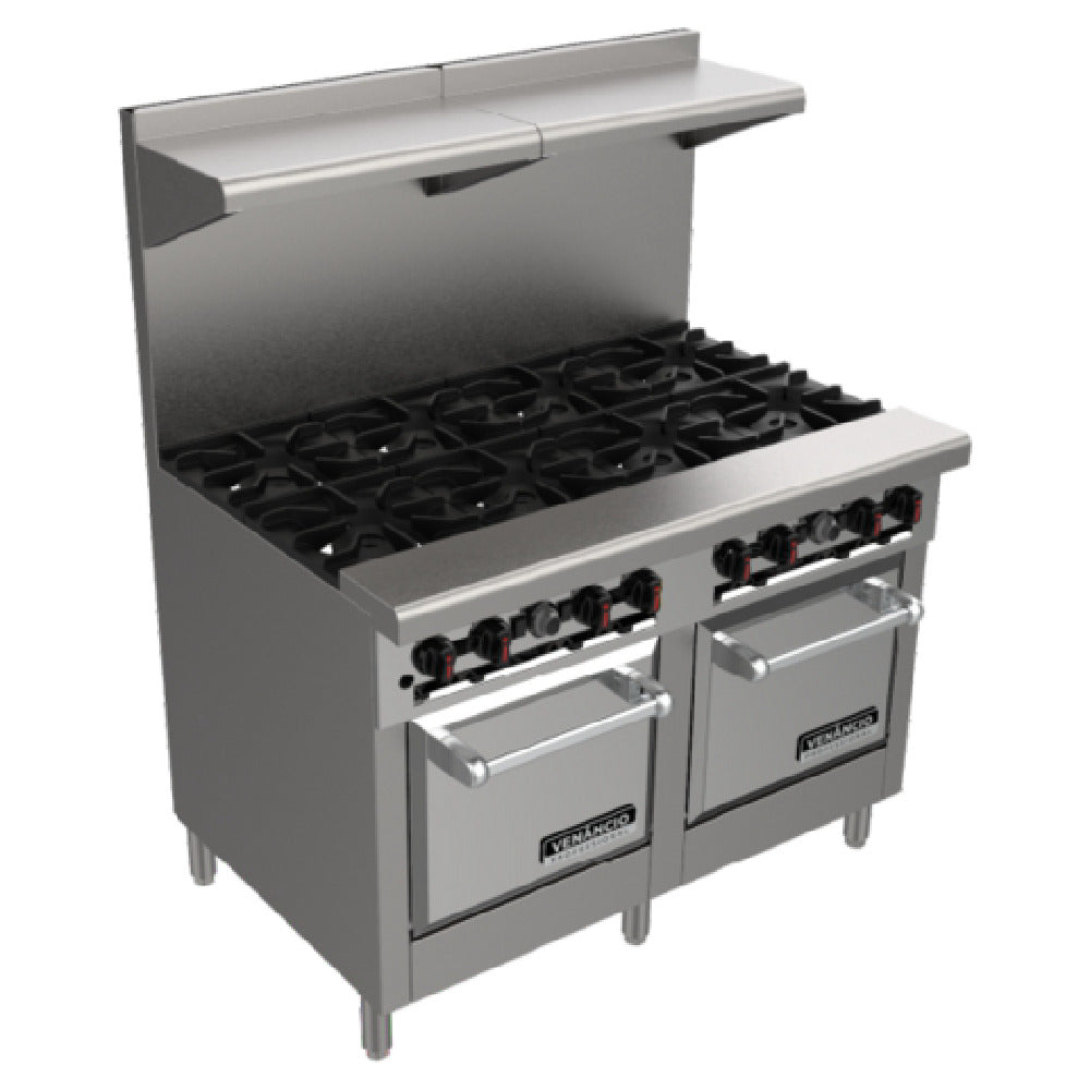 The Venancio R24CO-24B_NAT Restaurant Range is a high-performance 24-inch wide gas appliance designed for culinary professionals seeking precision and reliability. Equipped with four two-piece cast iron non-clog burners, this range ensures consistent heat distribution and easy maintenance. The removable cast iron grates provide versatility and robustness, accommodating various cooking styles. Each burner features an independent manual control valve, allowing chefs to fine-tune their cooking settings. The built-in convection oven, complemented by a two-speed fan and spark ignition system, enhances baking efficiency and quality, with three racks and four shelf positions for flexible use. The range also includes a 22-1/2-inch high two-piece back guard with a removable over-shelf for added convenience. Constructed with a sturdy 14-gauge interlocking fully welded frame, the range offers long-lasting durability. With a stainless steel front, sides, and removable crumb tray, it ensures ease of cleaning and maintenance. Its 4-inch adjustable legs allow for optimal height adjustment. Engineered for power, it delivers an impressive 158,000 BTU and operates on 115 volts with a 3.70 amp current. The inclusion of a cord and plug, alongside a LP conversion kit and pressure regulator, ensures seamless installation. This product is cULus and UL EPH Classified, affirming its quality and safety standards.