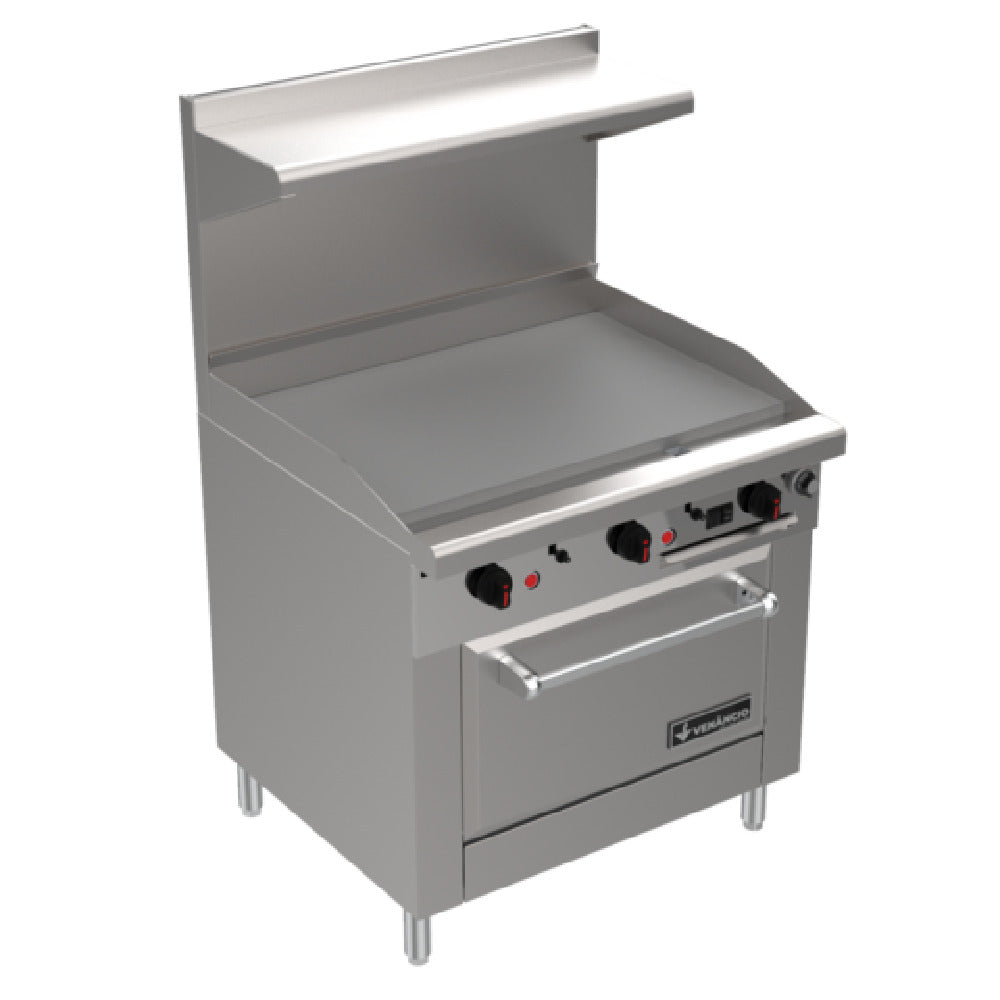 The Venancio R36CO-36T Restaurant Range Gas 36"W is a powerful and versatile kitchen appliance designed for commercial culinary environments. This unit is outfitted with a 36-inch wide griddle top, featuring a robust 1-inch thick griddle plate, ideal for even heat distribution and efficient cooking. It includes three high-performance 25,000 BTU burners, providing ample cooking power for high-demand kitchens. The adjustable thermostat control offers a broad temperature range from 160 to 500°F, accommodating various cooking needs. Additionally, the range includes a 35,000 BTU convection oven, equipped with a snap action thermostat that ranges from 250°F to 500°F, ensuring precise baking and roasting. The oven comes with three racks and four shelf positions, enhancing cooking versatility. Its fully welded structure and stainless steel front and sides promise durability and longevity. The convection oven features a two-speed fan and spark ignition, enhancing efficiency and reliability. For ease of cleaning, the range is equipped with a removable grease pan. Its 6-inch adjustable legs provide stability and allow for height customization. The unit is cULus and UL EPH Classified, assuring safety and compliance, and includes an LP conversion kit for flexible fuel options. This comprehensive design makes it a valuable asset in any professional kitchen.